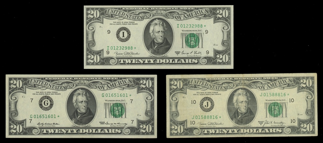 1969 $20 STAR Federal Reserve Note Trio. 1969. G*. AU; 1969 B. J*. Fine-About VF; and 1969 C. I*. AU-Unc. [3]