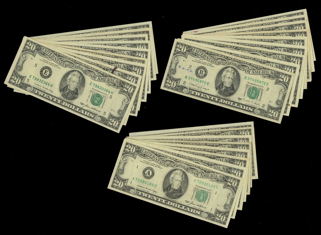 1985-1988 A $20 Federal Reserve Notes. 1985. District letters: A (3), D (3), E (4, one with ink mark), G, H; J*, K, L (2). The J* and K Uncirculated; 1988 A. District letters: B (2), B*, C, D, E, G (2), L (2). The B* Unc. VF-Unc. [26]