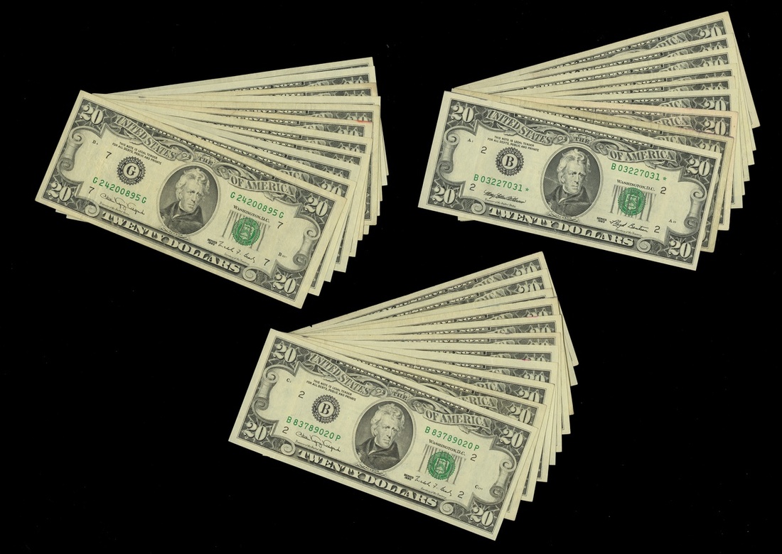 1990-1993 $20 Federal Reserve Notes. 1990, D.C. printing. District letters: B (2), D (2), D*, E (3), F (3), G (5). The D* Uncirculated; 1993, D.C. printing. A (2), A*, B (4), B*, E (3), F and K; and 1993, Fort Worth printing. G, L, and L*. VF-CU. [32]