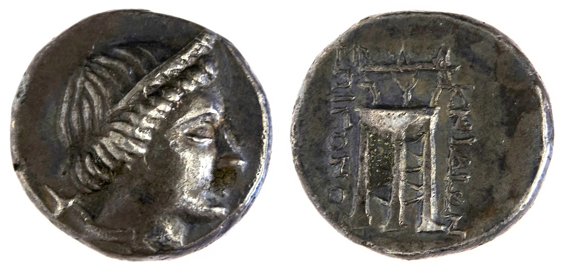 Caria. Knidos. AR Tetrobol, ca. 250-210 BC. Epigonos, magistrate. 2.6 gms. Head of Artemis right, with quiver, rev. Tripod. SNG Copenhagen 281. Toned. Good Very Fine.