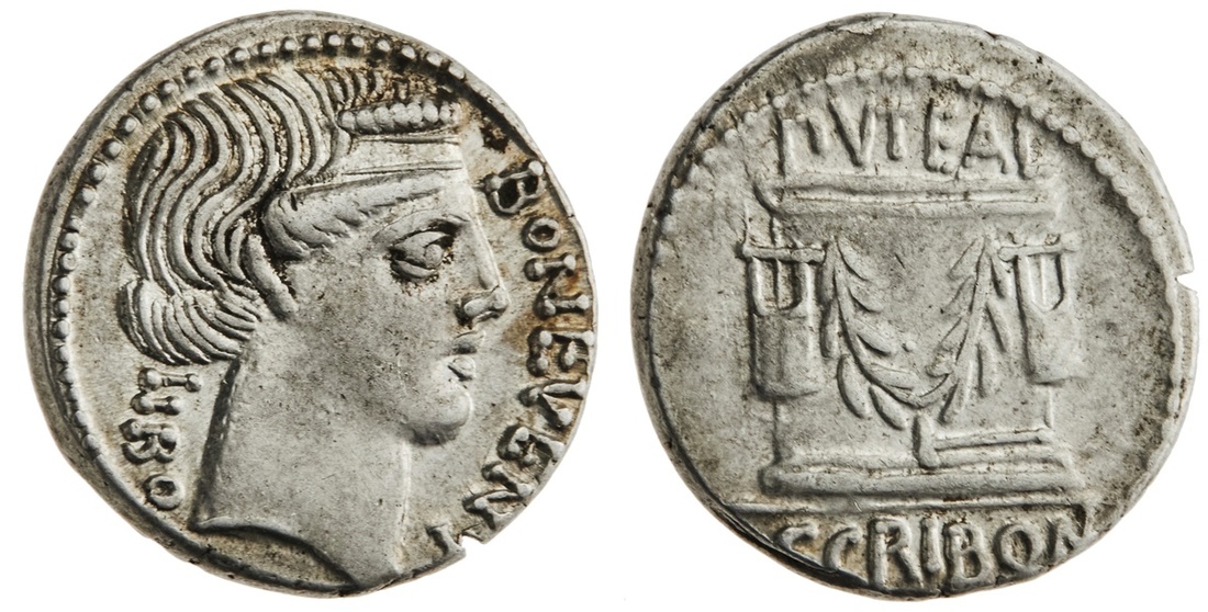 Roman Republic. L. Scribonius Libo. AR Denarius, 62 BC. 3.9 gms. Head of Bonus Eventus right, rev. Scribonian wellhead garlanded and adorned with two lyres, hammer below. Crawford 416/1a, Syd.928, Scribonia 8. Extremely Fine.