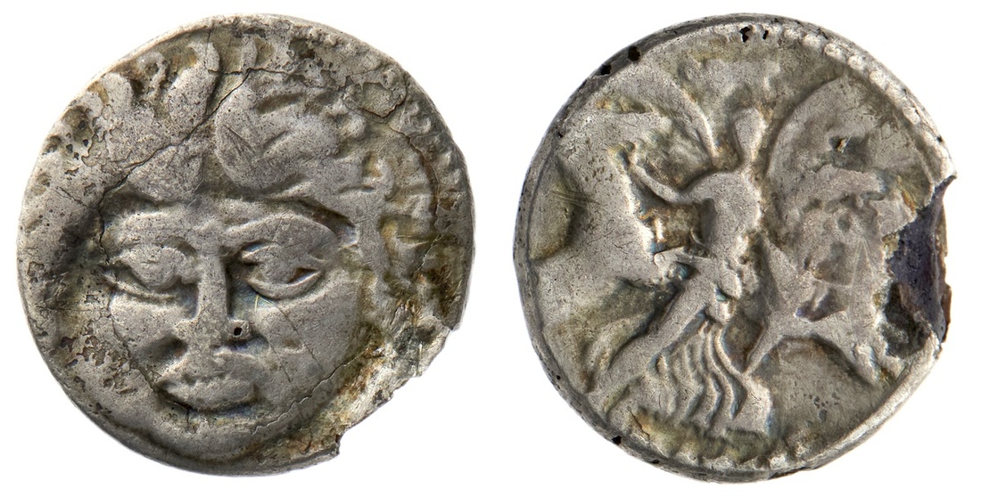 Roman Imperatorial. Moneyer issues. L. Plautius Plancus. Fourrée Denarius, 47 BC. 2.7 gms. Facing mask of Medusa, rev. Aurora flying right conducting the four horse of the sun. Cf.Craw.453/1, Plautia 14. Core exposed at edge crack. Fine.