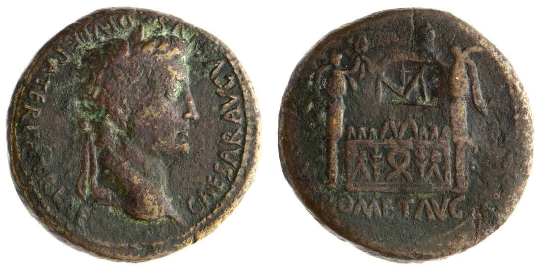 Roman Imperial. Augustus (27 BC-14 AD). AE Sestertius. Lugdunum (Lyon), struck 10-14 AD. 25.2 gms. CAESAR AVGVSTVS DIVI F PATER PATRIAE, laureate head right, rev. The front elevation of the celebrated Altar of Lugdunum adorned with corona civica flanked by two nude male figures, columns at either ends with Victories facing each other; ROM ET AVG in ex. C/m M with cross above the altar. RIC 231a. Rare. Olive-brown over some roughness, light green earthen hues. About Very Fine.