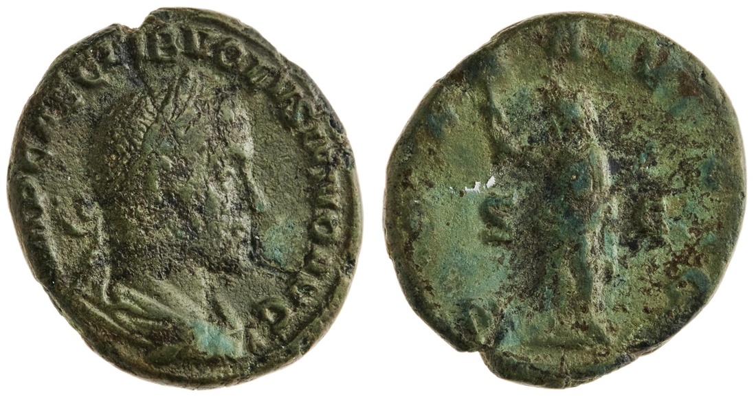 Roman Imperial. Volusian (251-253). AE As. 6.8 gms. Laureate, draped and cuirassed bust right, rev. Pax standing left, holding branch and scepter. RIC 256b. Olive-green patina over minor roughness. About VF.