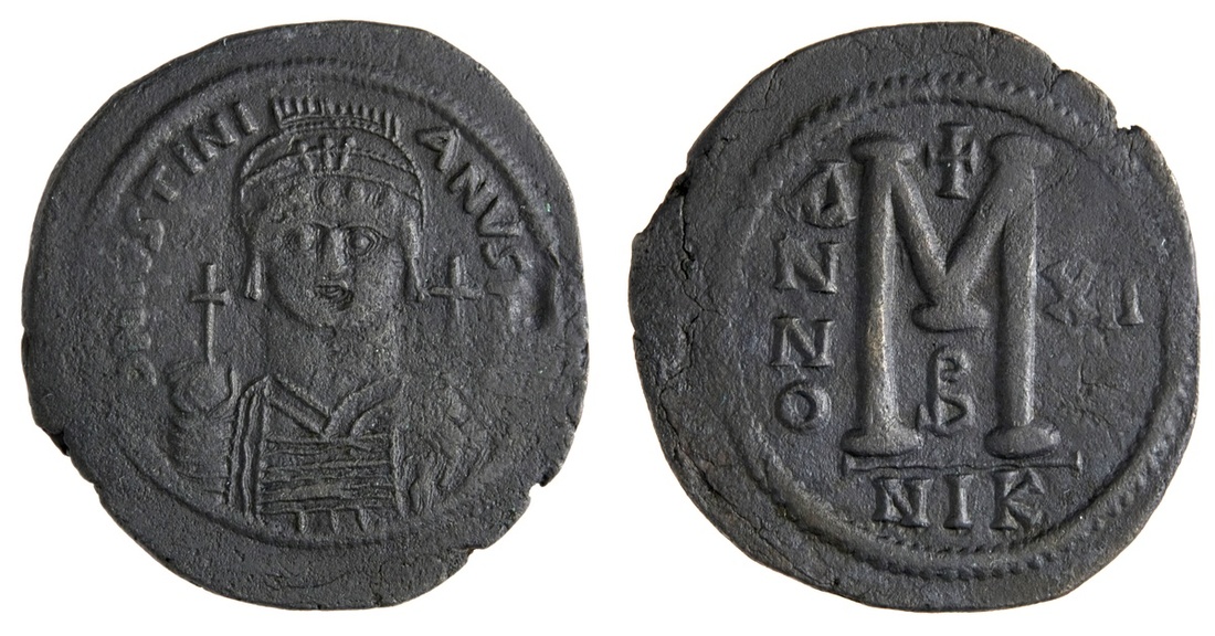 Byzantine Empire. Justinian I (527-565). AE Follis. Nicomedia, 2nd Officina, regnal year 12. 41.5mm, 22.72 gms. Helmeted and cuirassed bust facing holding globus and shield, cross in right field, rev. Large M, cross above, B below; NIK in ex. SB 201. Deep olive-brown over some roughness and porosity. Very Fine.