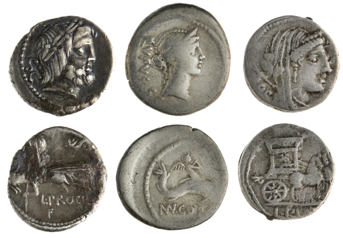 Rome. Trio of AR Moneyer Denarii. Republic. L. Rubrius Dossenus, 87 BC. 3.8 gms. Veiled head of Juno right/Triumphal quadriga, Victory above. Craw.348/2; L. Procilius, 80 BC. Juno head right/ Juno Sospita hurling spear right. Craw.379/1; and Imperatorial. Mn. Cordius Rufus, 46 BC. 3.5 gms. Diademed head of Venus right/Cupid riding dolphin right. Craw.463/3. The second Toned VF with reverse corrosion, the other two: About Fine-Fine. (3)