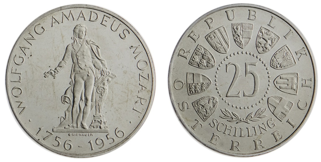 Austria. Republik. Proof 25 Schilling, 1956. 200th Anniversary of the Birth of Wolfgang Amadeus Mozart. KM 2881. Proof mintage of 1,000 pieces. PCGS PR 62.