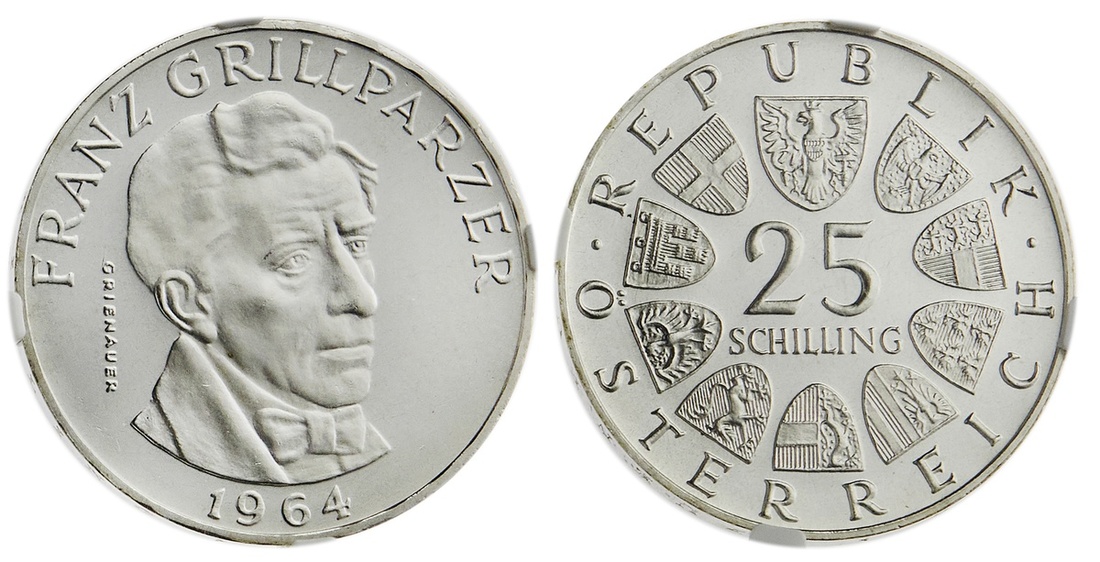 Austria. Republik. Proof 25 Schilling, 1964. Franz Grillparzer. KM 2895.1. NGC PF 66 ULTRA CAMEO.