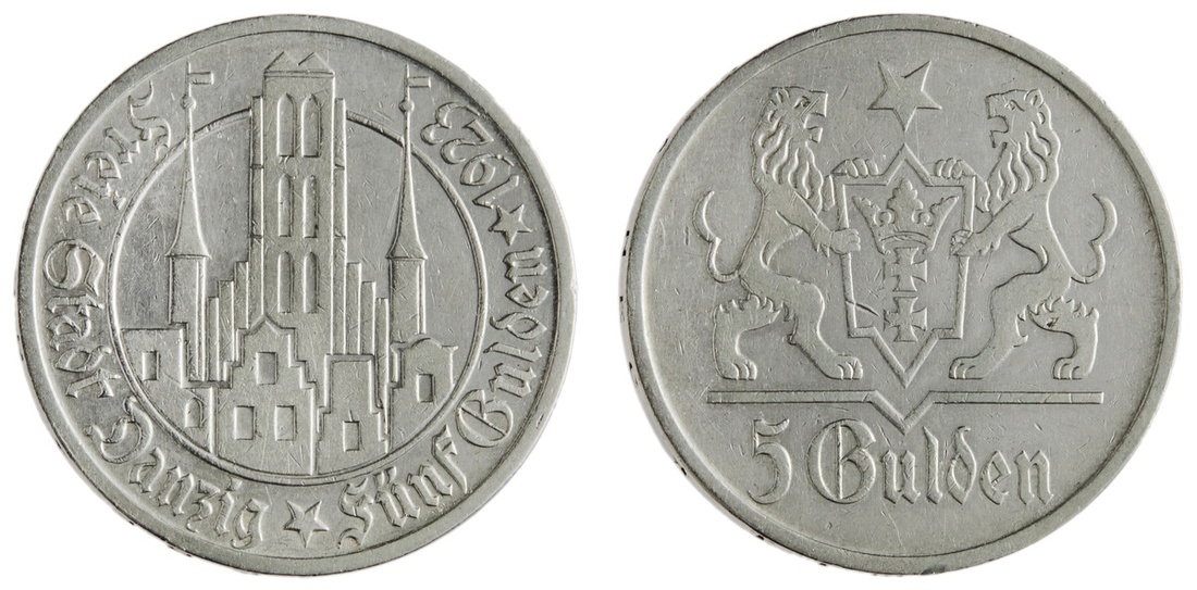 Danzig. Freiestadt. 5 Gulden, 1923. Marienkirche within circle, rev.. Supported Arms. KM 147. Extremely Fine.