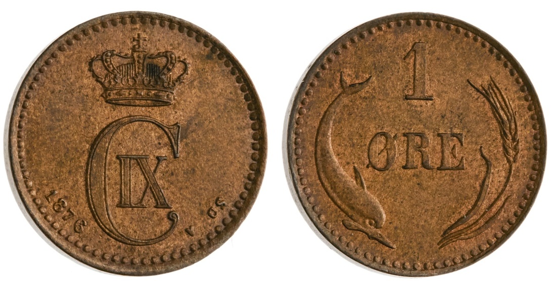 Denmark. Christian IX (1863-1906). 1 Øre, 1876 CS. København. Crowned CIX monogram, rev. Value flanked by wheat stalk and dolphin. KM 792.1. Key date. EF-AU.