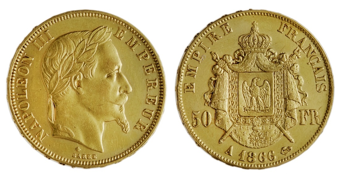 France. Napoleon III (1852-1870). 50 Francs, 1866 A. Paris. Laureate head right by Barre, rev. Crowned and mantled Arms over cross scepters. KM 804.1. Some hairlines. About Extremely Fine.