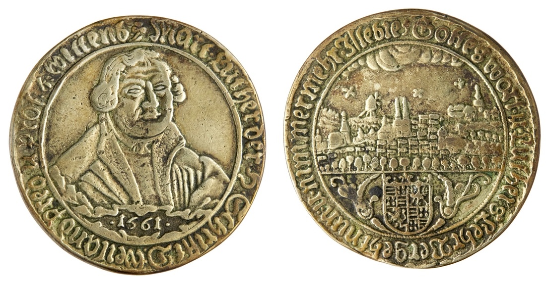German States. Eisleben. Medallic ¾ Taler, 1661. Centennial of the Naumburg Convention. 22.01 gms. Bust of Martin Luther facing ¾ right, date below, rev. Cityview, clouds above, Mansfeld Arms below. Whiting 137. Once lightly gilded. About Very Fine.