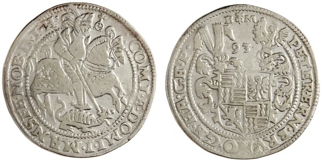 German States. Mansfeld-Friedeburg. Peter Ernst, Bruno II, Gebhard VIII and Johann-Georg IV (1587-1601). Taler, (15)93 BM. Eisleben. St. George slaying the dragon, rev. Bi-helmeted Arms. Tornau 599, MB 52, Dav.9510. White silver. Very Fine.