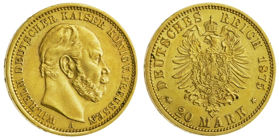 German States. Prussia. Wilhelm I (1861-1888). 20 Mark, 1875 A. Bare head right, rev. Imperial eagle. KM 505. Good Extremely Fine.