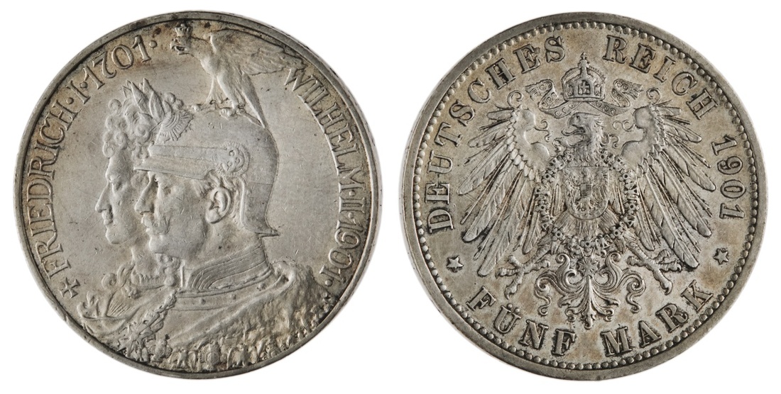 German States. Prussia. Wilhelm II (1888-1918). 5 Mark, 1901 A. Bicentennial of the Kingdom. Conjoined busts of Wilhelm II, helmeted, and Friedrich I, laureate left. KM 526. About Uncirculated.