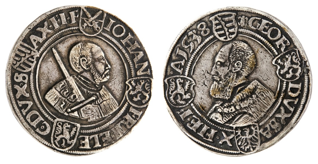 German States. Saxony - Ernestine. Johann Friedrich I and Georg (1534-1539). Joint Coinage. Taler, 1538. Freiberg, Hans Hausmann, mintmaster. Bare-headed Johann Friedrich bust right, sword over shoulder, four Arms in legend, rev. Bare-headed bust of Georg left, four Arms in legend. Dav.9721, KM MB 200. Extensive tooling on busts. About Extremely Fine.
