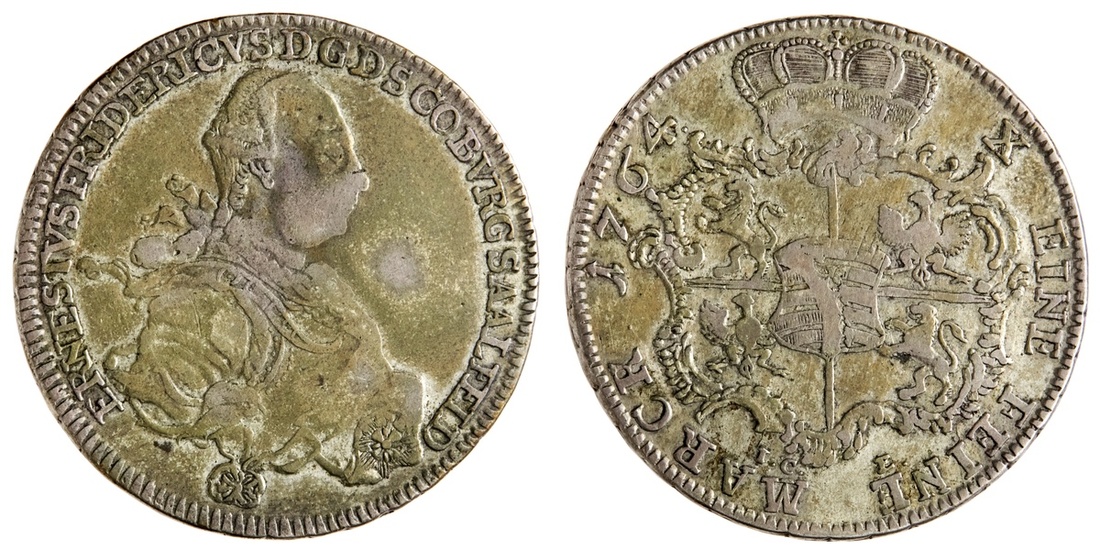 German States. Saxe-Coburg-Saalfeld. Ernst Friedrich (1764-1800). Taler, 1764 I.C.E. Cuirassed and peruked bust right wearing Order cross, rev. Crowned Arms. Dav.2751B, KM 76.1. Slate-gray. Very Fine.
