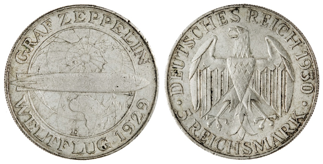 Germany. Weimar. 5 Reichsmark, 1930 E. Muldenhutten. Graf Zeppelin Flight. KM 68. Extremely Fine.