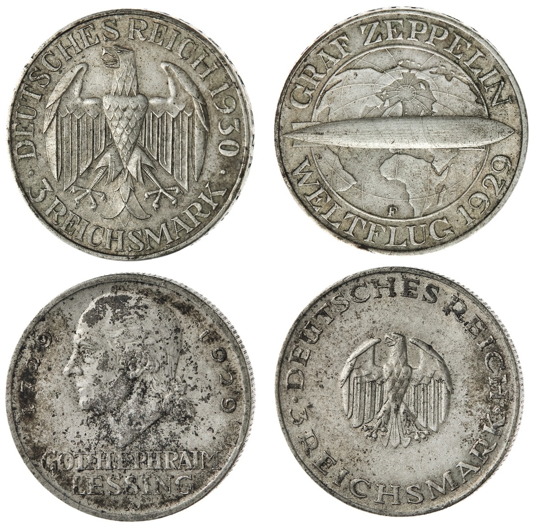 Germany. Weimar. Pair of Commemorative 3 Reichsmark. 1929 A. Gotthold Lessing Birth Bicentennial. KM 60. Speckled tone. EF-AU; 1930 F. Graf Zeppelin Flight. KM 67. EF. (2)
