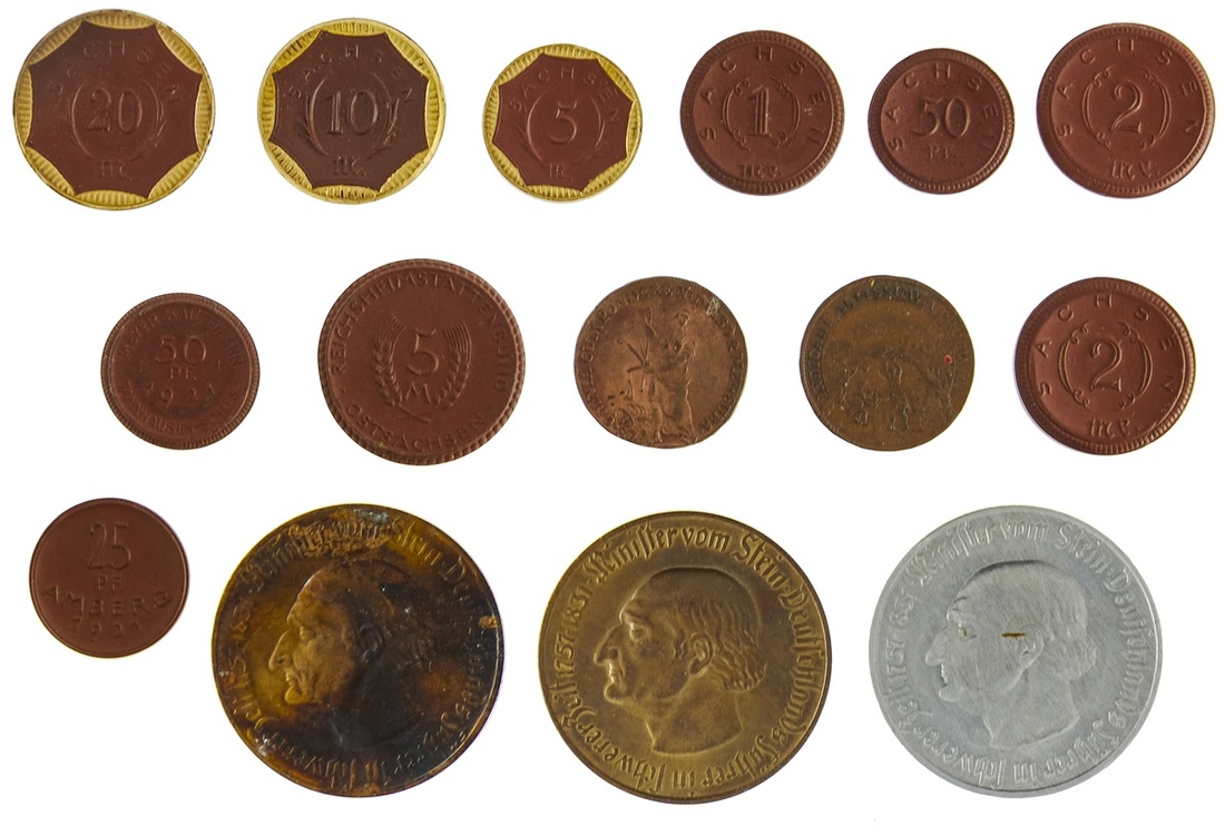 Germany. Small group of Porcelain and metal Notgeld. Porcelain. Saxony, 1921 set - 50 Pfennig, 1 and 2 Mark, gold-leafed 5, 10 and 20 Mark; missing lowest value, in original red case; additional Saxon 2 Mark, 1921; Amberg 25 Pfennig; Ostsachsen 5 mark, 1921; Tannhausen 50 Pfennig 1921; Metal - Westphalia. Aluminum 50 Million Mark, 1923; tombac 10,000 and bronze 50 Million Mark, 1923. V.Stein/Horse. EF-Unc.; also 18th Century AE Jettons - Clausthal, Johann Wilhelm Schlemm and Zellerfeld, J.A. Pfeffer. (15)
