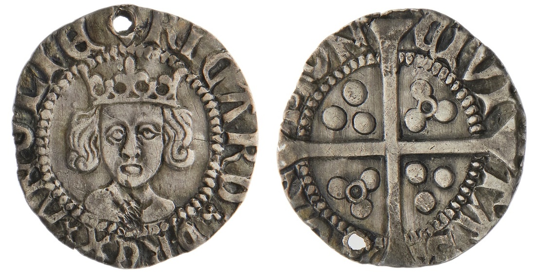 England. Plantagenets. Richard II (1377-1399). Penny. 0.7 gms. Crowned bust facing with bushy hair; RICARD (trefoil) D.REX x ANGLIE, rev Long cross, pellet triplet in each angle, annulet at center of two of the triplets. S.1689var. Rare. Holed at 12:00. Toned. Near Extremely Fine.