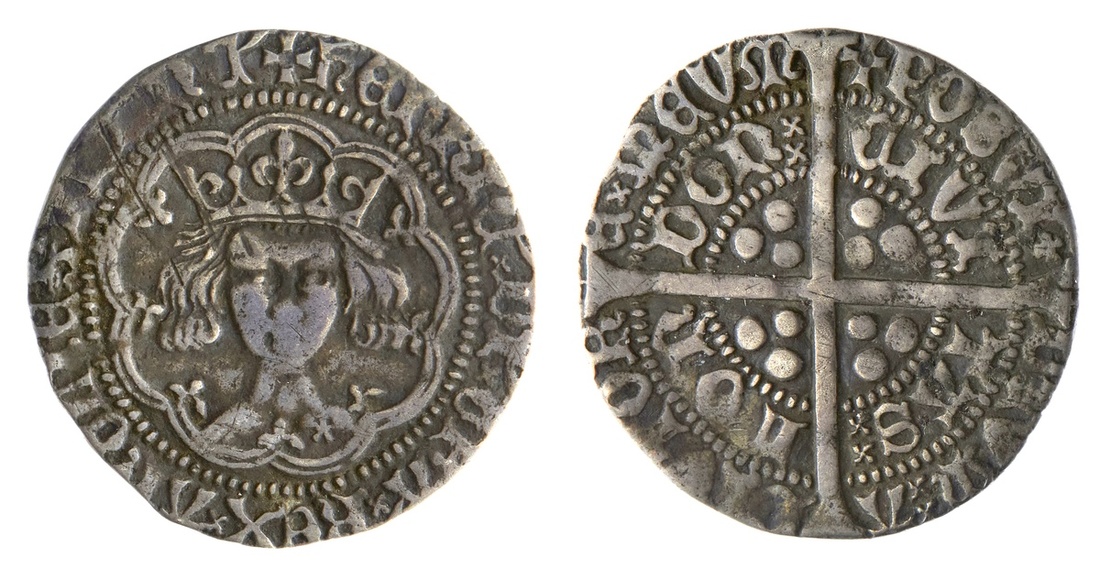 England. House of Lancaster. Henry V (1413-1422). Groat. 3.5 gms. Crowned facing bust, mullet on shoulder, within tressure, rev.. Long cross, pellet triplets in angles. S.1765. Toned over old test mark. Good Fine.