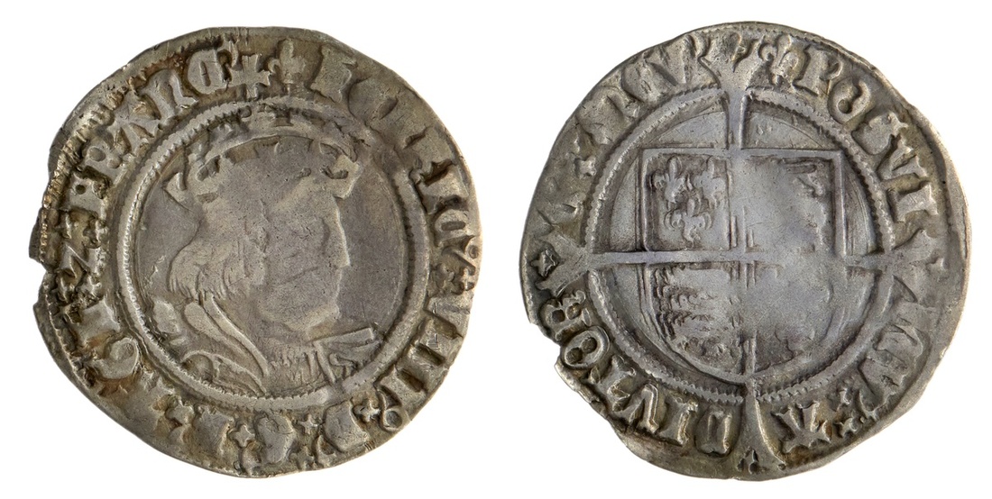 England. House of Tudor. Henry VIII (1509-1547). Second Coinage, 1526-44. Groat, mm. lis. 2.7 gms. Laker bust D, rev. Shield over cross fourchee. 2.7 gms. S.2337E. Some weakness at centers. Once wiped now toned. Fine.