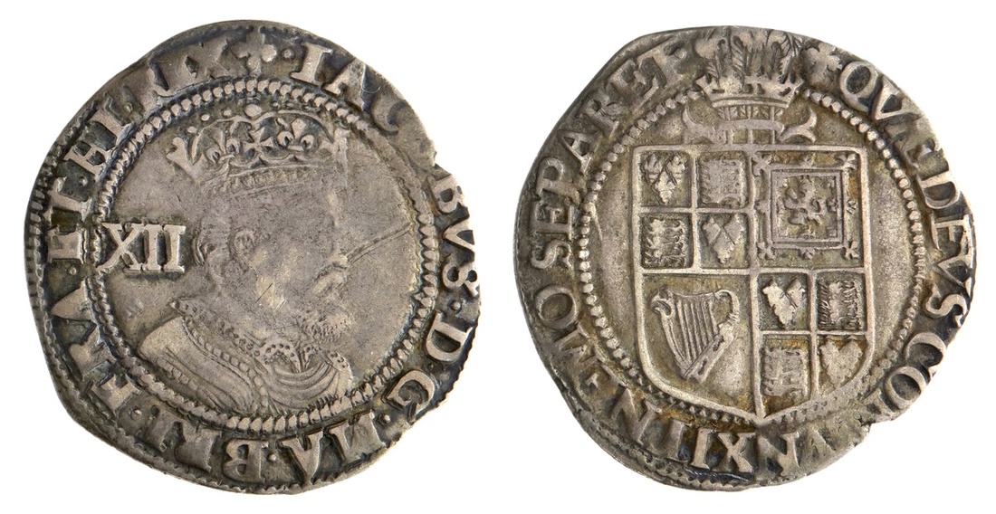 England. House of Stuart. James I (1603-1625). Third Coinage, 1619-25. Shilling, mm. trefoil (1624). 6.0 gms. Crowned bust right, XII behind, rev. plume over shield. S.2669. Toned over old test mark before bust. About Very Fine.