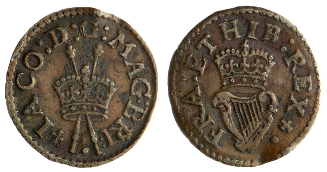 England.House of Stuart. James I (1603-1625). Farthing, mm. cross pattée. Oval flan. Crown and crossed scepters, legend starts at bottom, rev. Crowned harp. S.2681.Issued for use in Ireland. Some light deposits. Good Very Fine.