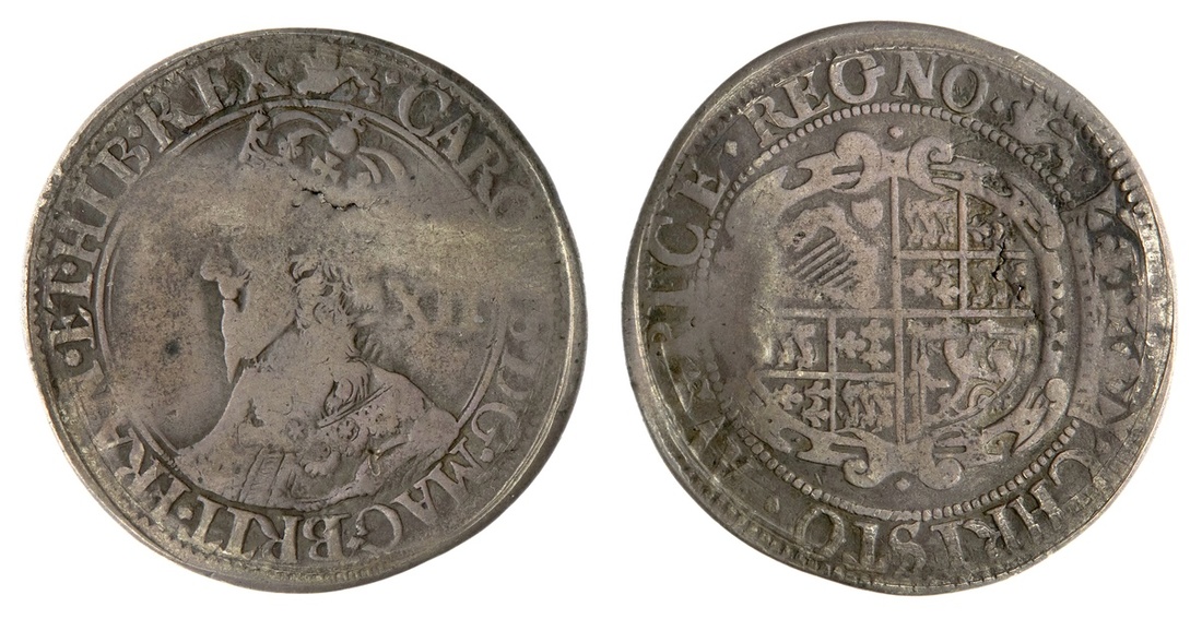 England. Charles I (1625-1649). Provincial Issues during the Civil War. York. Shilling, mm. lion (1643-44). 5.2 gms. Crowned bust left, XII behind, rev. Crowned and garnished oval Arms. S.2873. Light crease from strike, some weakness and minor flan flaw at center. Fine/About VF.