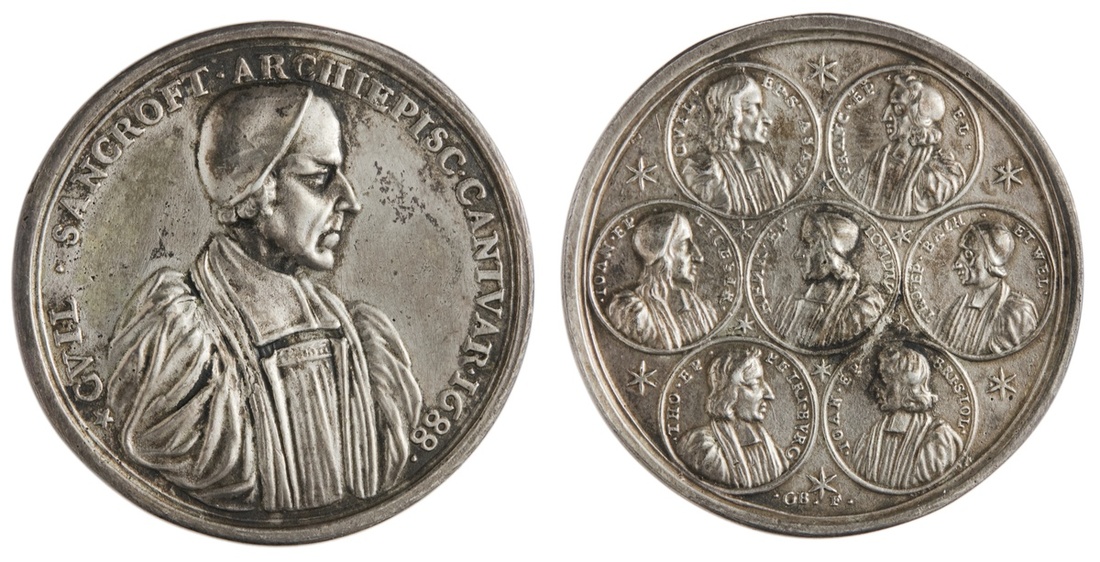 England. Archbishop Sancroft and the Bishops, 1688. Medal. Cast Silver, 50mm. 27.08 gms. Thin flan. By G. Bower. Clerically robed bust right wearing cap, rev. Six medallions around central medallion, each containing a cleric's bust - William Lloyd, Francis Turner, John Lake, Henry Compton, Thomas Ken, Thomas White and Sir John Trelawney, stars in angles. Eimer 288b. Toned over some hairlines in obverse field. Extremely Fine.