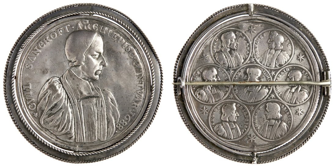 England. Archbishop Sancroft and the Bishops, 1688. Medal. Cast Silver, 49mm. By G. Bower. Clerically robed bust right wearing cap, rev. Six medallions around central medallion, each containing a cleric's bust - William Lloyd, Francis Turner, John Lake, Henry Compton, Thomas Ken, Thomas White and Sir John Trelawney, stars in angles. Eimer 288b. Set as brooch pin. Very Fine.