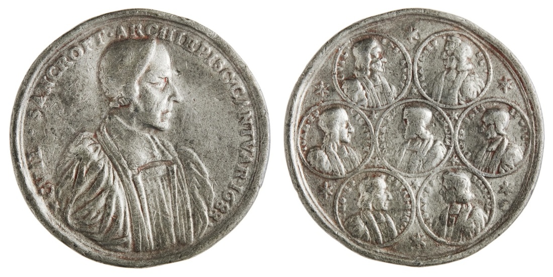England. Archbishop Sancroft and the Bishops, 1688. Medal. Pewter, 49.6mm. Thin flan. By G. Bower. Clerically robed bust right wearing cap, rev. Six medallions around central medallion, each containing a cleric's bust - William Lloyd, Francis Turner, John Lake, Henry Compton, Thomas Ken, Thomas White and Sir John Trelawney, stars in angles. Cf.Eimer 288b. Contact marks typical of this softer metal. Very Fine.