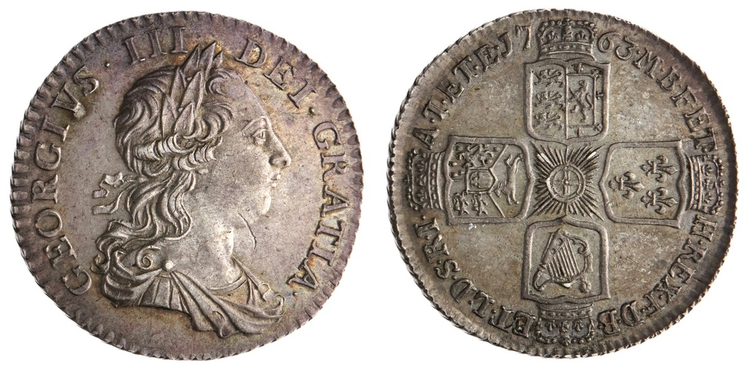 Great Britain. George III (1760-1820). "Northumberland" Shilling, 1763. Young, laureate and draped bust right, rev. Crowned cruciform Arms. S.3742, KM 597. Toned over old scratch below chin. Uncirculated.