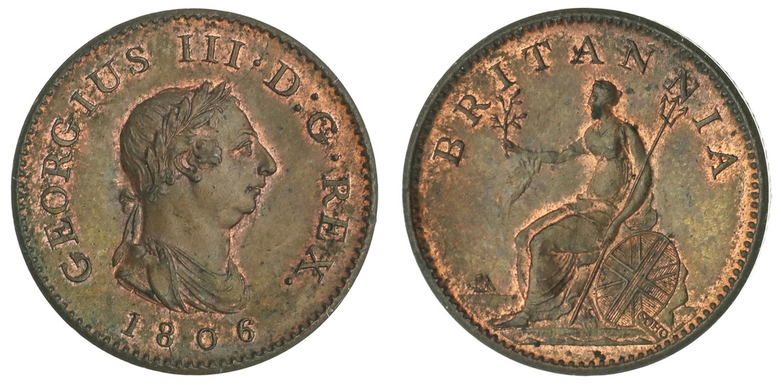 Great Britain. George III (1760-1820). Farthing, 1806. Short-haired, laureate and draped bust right, K on truncation, rev. Britannia seated left. S.3782, KM 661. Brown with orange-red highlights. Very Choice Brilliant Uncirculated.