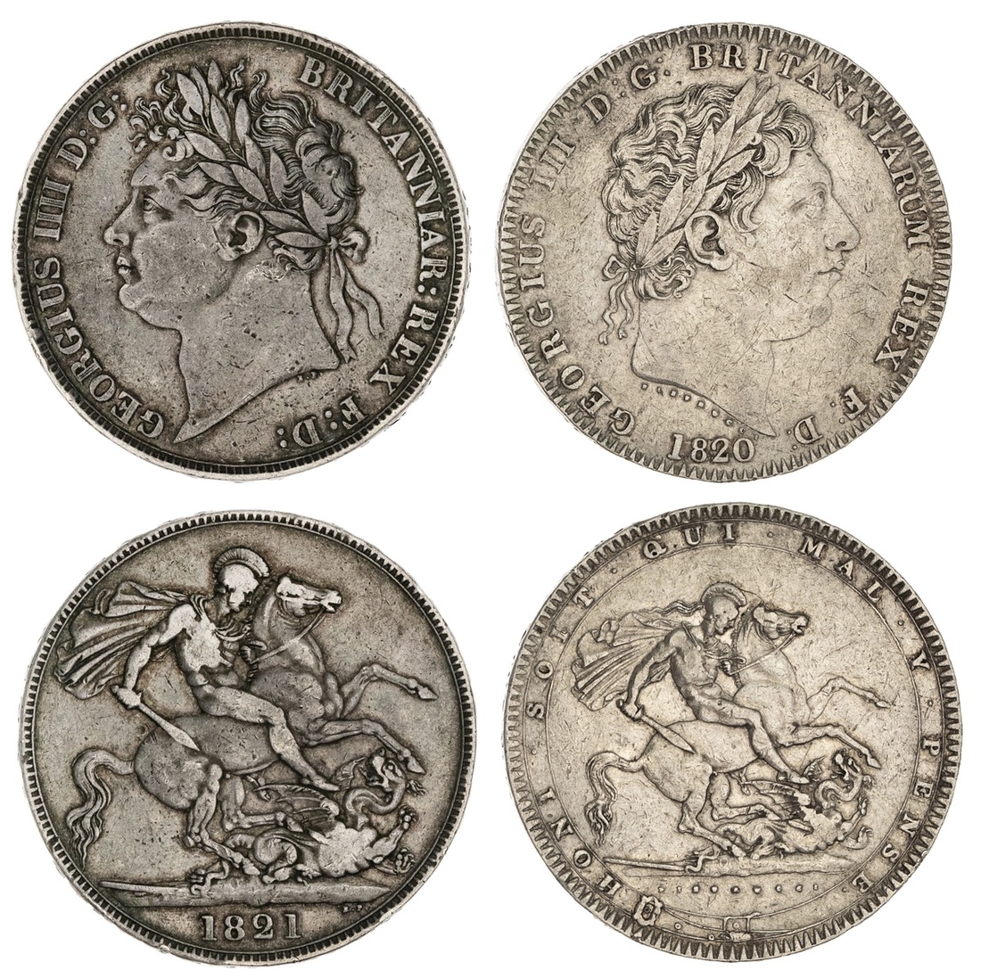 Great Britain. George III-IV Pair of Crowns. 1820. Laureate head right, rev. St. George by Pistrucci. S.3787, KM 675. Once wiped, contact marks. Very Fine; 1821. Secundo. Laureate head left, rev. St. George. S.3805, KM 680.1. Edge tics. About VF.
