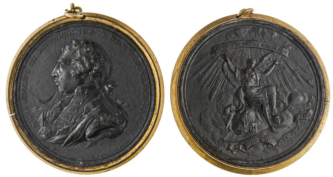 Great Britain. George III. 1809 Jubilee of George the Third's Reign. Medal. White Metal, 52mm. By P. Wyon. Uniformed, peruked bust left, rev. Angel seated on clouds heralding George's reign. BHM 652. Darkened. Scrape before neck. Otherwise Extremely Fine. Set in a period looped brass ring frame. From the collection of noted archaeologist Ivor Noël Hume, OBE.