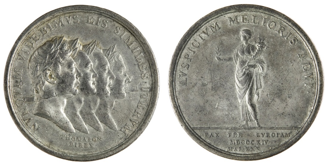 Great Britain. George III. Napoleonic. Treaty of Paris, Peace in Europe, 1814. Medal, 48mm. White Metal. By E. Thomason. Conjoined and laureate heads of George Prince Regent, Tsar Alexander I, Franz II and Friedrich Wilhelm III right; NVMQVAM VIDEBIMVS EIUS SIMILES ITERVM around, rev. Pax standing left, holding olive branch and cornucopiae; AVSPICIVM MELIORIS AEVI. BHM 802, Bramsen 1459, Diakov 385, Eimer 1045. Marks in field typical of white metal, otherwise Good Very Fine.