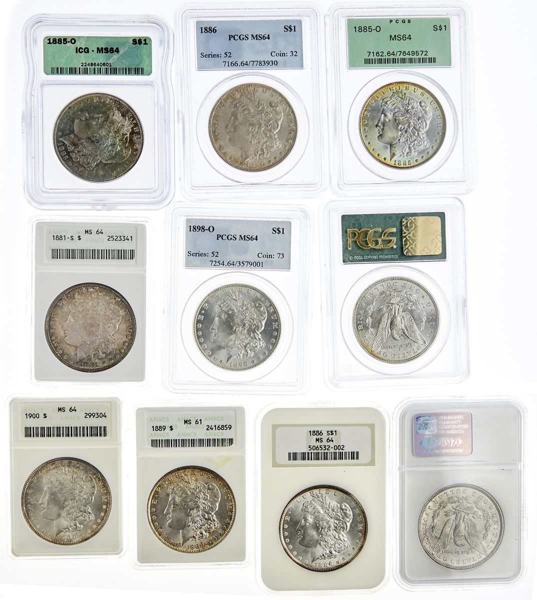 Group of encapsulated Morgan Dollars. 1881-S ANACS MS 64, 1882-S PCGS MS 63 rainbow toning, 1885-O (2) PCGS MS 64 and ICG MS 64 both with attractive toning, 1886 (2) PCGS MS 64 and NGC MS 64, 1887 NGC MS 63, 1889 ANACS MS 61, 1898-O PCGS MS 64, and 1900 ANACS MS 64. (10)