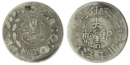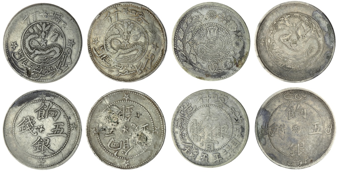 China, Xinjiang Province (Sinkiang), Hsüan-t'ung, 5 Mace or 5-Miscals, 'Flying Dragon' Types (8), including: 'General Issue', 1910, Kashgar, rev. large rosette in centre, edge milled, 17.54g, 2h (L&M-819A; KM Y6.6), some staining to peripheries, otherwise lightly toned, almost very fine; also, AH 1327, edge milled, 17.45g, 6h (L&M 752; KM Y25.1), areas of striking softness and rub, some toning, largely fine, a scarcer variety; another, AH 1327, similar, 18.31g, 6h (L&M 752; KM Y25.1), lightly toned, almost very fine, scarce; others, Undated Issues (3), 16.47g, 6h; 17.98g, 1h; and, 16.20g, 10h (KM Y25), all lightly toned, the last with flatness, otherwise fine to a bolder fine; lastly, (Xuantong [Puyi]), AH 1329, edge milled, 17.48g, 5h (L&M 761; K 1143G; KM Y31; WS 1247), a metal flaw at obverse 7 o'clock, otherwise partially toned with some softness, almost very fine; another, AH 1329, similar, 17.14g, 7h (L&M 763; K 1153f; KM Y31.2; WS-1245), damaged by solder where removed from mount on reverse, otherwise lightly toned and lustrous, struck details very fine (8)