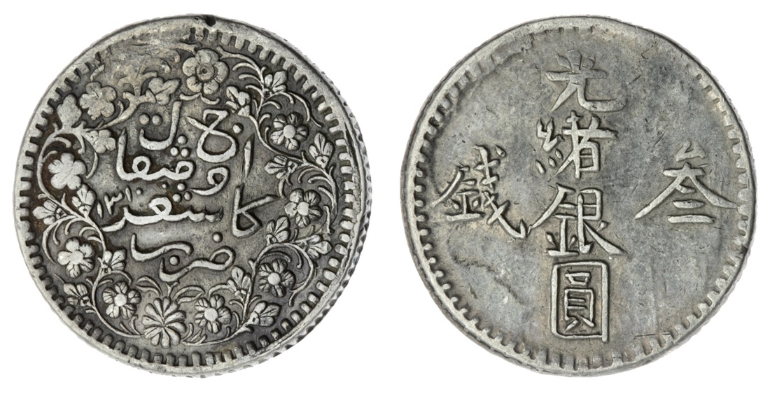 China, Xinjiang Province (Sinkiang), Hsüan-t'ung, 3-Maces or 3-Miscals (5), AH 1310 [1893], Kashgar, Kuang-hsu (Guangxu) Mint, 10.59g, 12h (L&M 684; KM Y18; WS-1168), some peripheral striking flatness, otherwise toned, very fine; another, AH 1311 [1894], 10.02g, 11h (L&M-688; Kann 1046; KM Y18; WS-1175), peripherally and centre flatness, otherwise fair; also, AH 1321 [1903], 10.28g, 6h (L&M-722; KM Y18a.1; WS-1208), removed from a mount with resultant rim damage at obverse 6 o'clock, otherwise naturally toned, very fine with some residual flare; lastly, AH 1324 [1906] (2), 10.49g, 10h; another, 10.28g, 11h (L&M-803; KM Y34a; WS-1281), the first richly toned, good very fine, the second lightly cleaned, bolder than very fine (5)