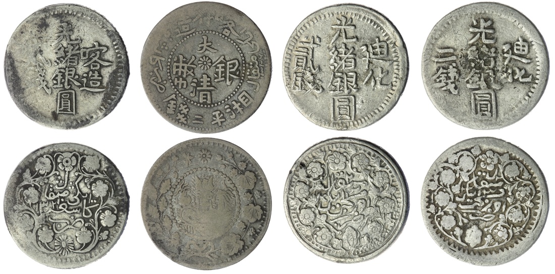 China, Xinjiang Province (Sinkiang), Hsüan-t'ung, 2-Maces or 2-Miscals (4), AH 1321 [1903], Kashgar, Kuang-hsu (Guangxu) Mint, 6.74g, 6h (KM Y17a.1), stained, with striking flatness, fine or marginally better; another, AH 1322 [1904], 6.90g, 12h (KM Y33; L&M-795; WS-1271), residually lustrous, good fine; also, AH 1324 [1906], 6.92g, 12h (L&M-804; KM Y33.1; WS-1218), slight surface marks, otherwise residually lustrous, a really bold very fine; lastly, AH 1326 [1908], 6.77g, 12h (L&M-751; Kann 1127; KM Y23), peripheries and centres quite flat, otherwise toned, about fine, rare (4)