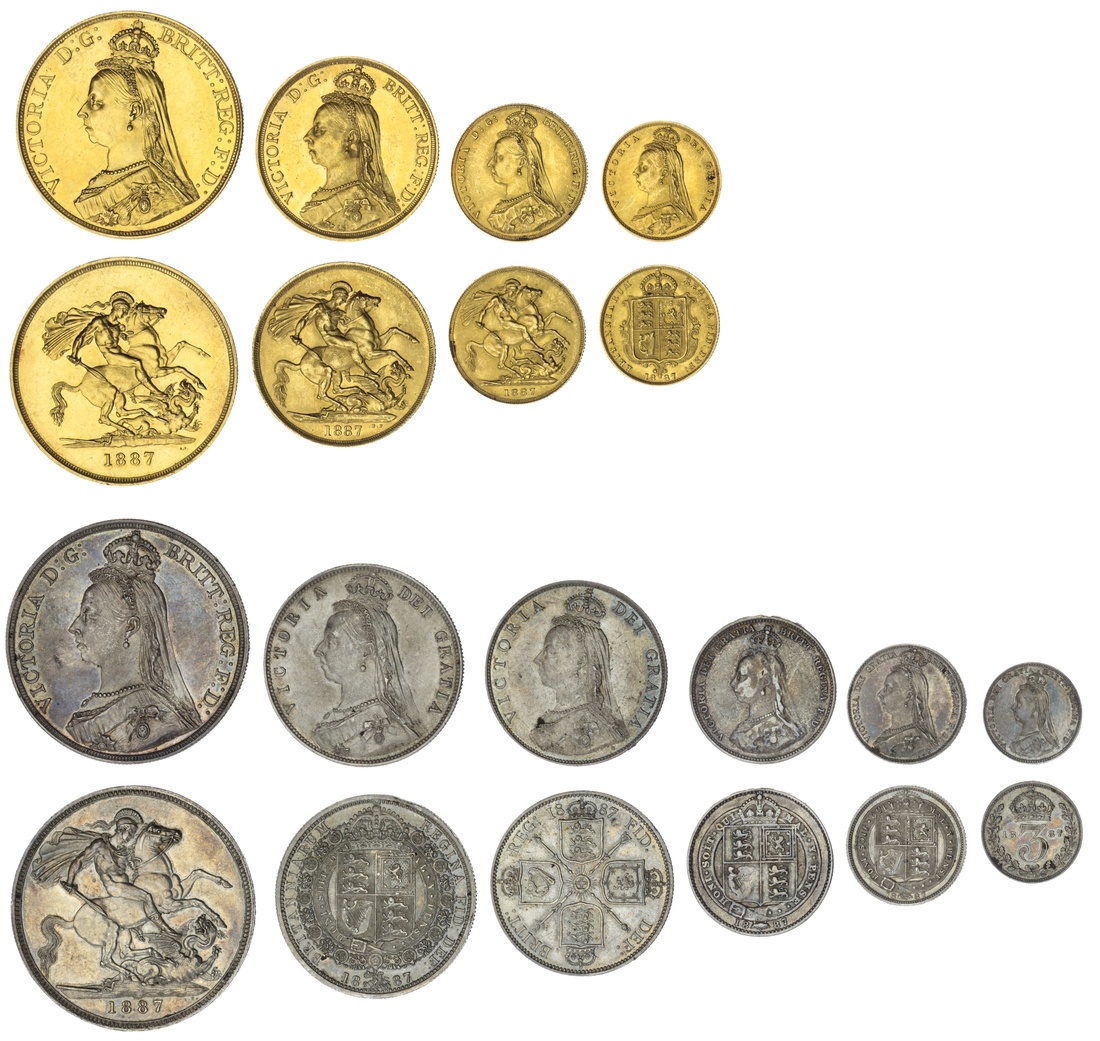 Victoria (1837-1901), 'Golden Jubilee', Currency Specimen Set, 1887 (11), Five-Pounds to Half-Sovereign, Crown to Threepence, a lovely composite set, the Five-Pounds faintly bagmarked, otherwise lustrous, the Two-Pounds, Sovereign and Half-Sovereign all rather choice; the Silver well-matched and toned, good extremely fine or better, in contemporary fitted case (11)