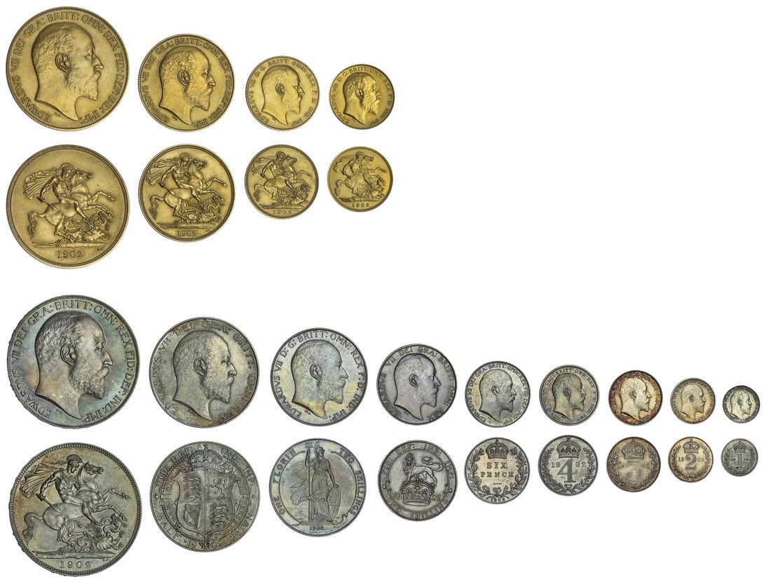 Edward VII (1901-1910), Coronation Specimen 'Long' Set, 1902 (13), Matte Proof Five-Pounds to Half-Sovereign, Crown to Sixpence and Maundy Penny (Spink PS9), a superb 'sandblasted' Proof set, the silver lightly toned, all much as struck, with Royal Mint case of issue (13)