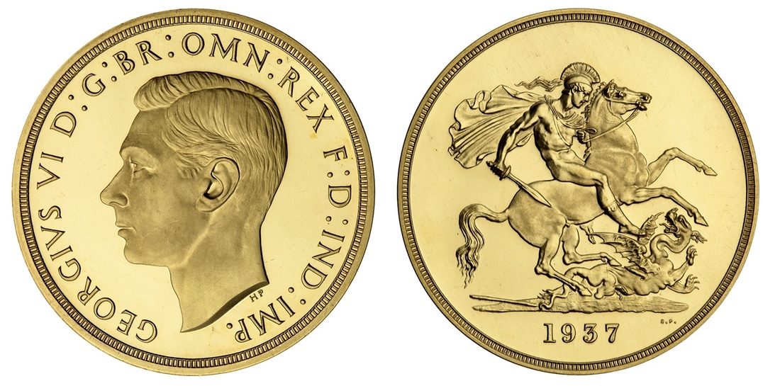 George VI (1936-1952), Coronation 'Specimen' Proof Five-Pounds, 1937, bare head left, rev. St. George and Dragon, edge plain, 40.01g, 12h (W&R 435; Spink 4074), a scarcely perceptible hairline before chin, otherwise a blindingly glorious MINT GEM with sumptuous cameo frosting in sharp contrast to glass-like fields, brilliant FDC