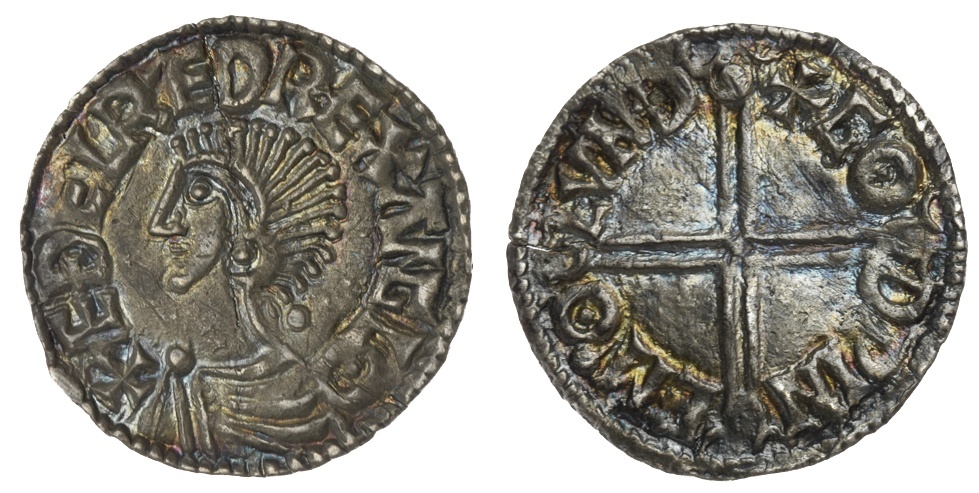 Aethelred II 'the Unready' (978-1016), Longcross Type, Penny, c. 997-1003, London, Godwine, diademed and draped bust left, rev. + GODPINE M'O LVND, voided longcross, angles plain, 1.21g, 4h (North 774; BMC IVa; Spink 1151), subtly crimped, but rich dark cabinet toning, a really very good very fine, and pleasing