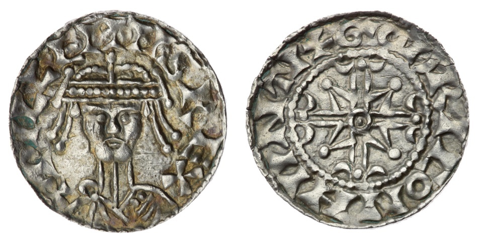William the Conqueror (1066-1087), 'Bonnet Type', Penny, Huntingdon, Godric, crowned bust facing, rev. + GODRIC ON HVNTI, voided short cross, pellet-tipped piles in angles, 1.02g, 2h (to i.m.) (North 842; BMC II; Spink 1251), speckles of verdigris, otherwise bright and residually lustrous, a bolder very fine, rare