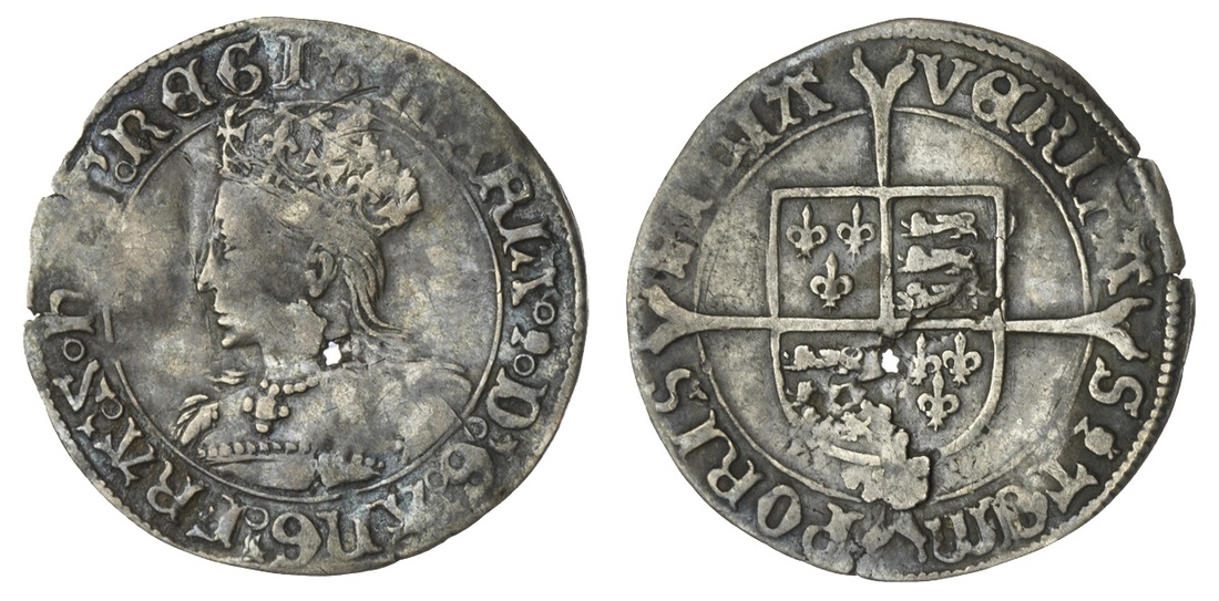 Mary, Sole Reign (1553-1554), Groat, Tower, crowned bust left, rev. square-topped shield over cross fourchée, 2.01g, 7h, m.m. pomegranate (North 1960; Spink 2492), pierced at centre with minor flan splits to edge, otherwise darkly toned with areas of striking softness, nevertheless strictly fine / about very fine and even still above average for issue of this popular one-year 'Bloody Mary' type