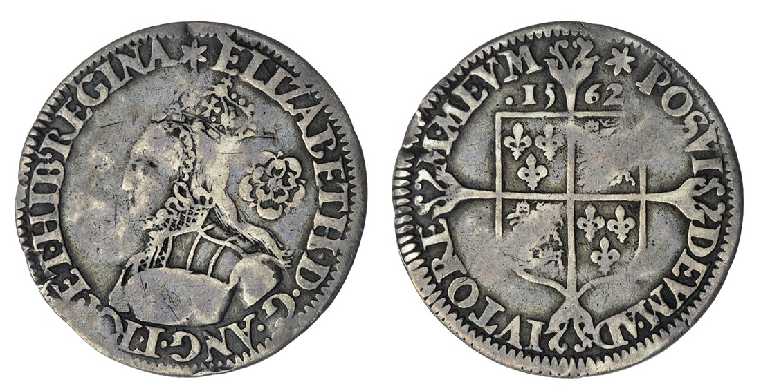 Elizabeth I (1558-1603), Mestrelle's Milled Issue, Sixpence, 1562, Tower [Upper House], tall narrow crowned bust B left, wearing plain bodice, large rose behind, rev. square-topped shield over cross fourchée, 2.53g, 6h, m.m. star (North 2026; Spink 2594), creased and crimped but subsequently straightened, about fine