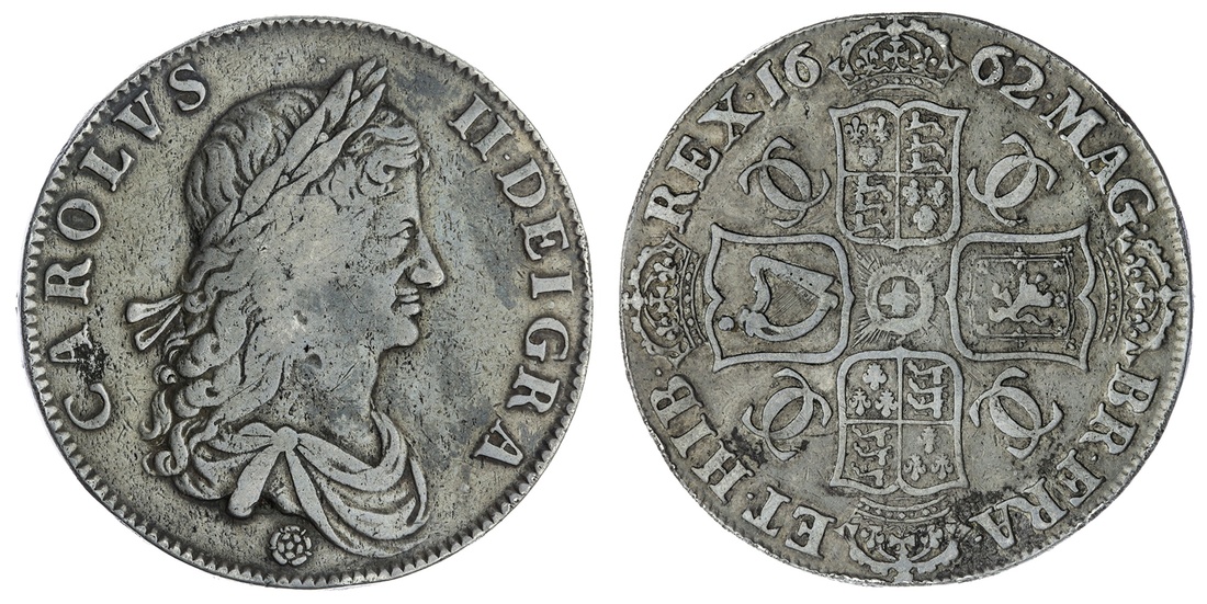 Charles II (1660-1685), 'Rose' Crown, 1662 [undated edge], Type A1, CAROLVS • II • DEI • GRA •, stop after GRA and above head, first laureate and draped bust right, rose below, rev. struck 'en médaille', stop after HIB, crowned shields cruciform, interlinked C's in angles, nine strings to harp, DECVS ET TVTAMEN widely spaced downwards on edge, 29.68g, 12h (Broad [1981] BC1; ESC -; Bull 342; Spink 3350A), the surfaces contact-marked and rubbed to central devices, nevertheless toned, residually lustrous, a bolder fine / very fine, this 'medallic' striking alignment very scarcely encountered